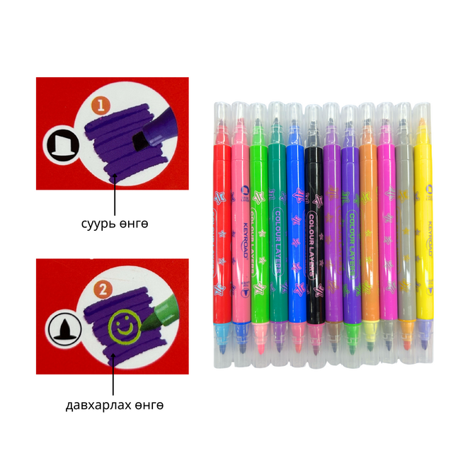 17см, 12 өнгө, гар хувцаснаас хялбар арилдаг, 2 талтай, өөр өнгөөр давхарлаж буддаг